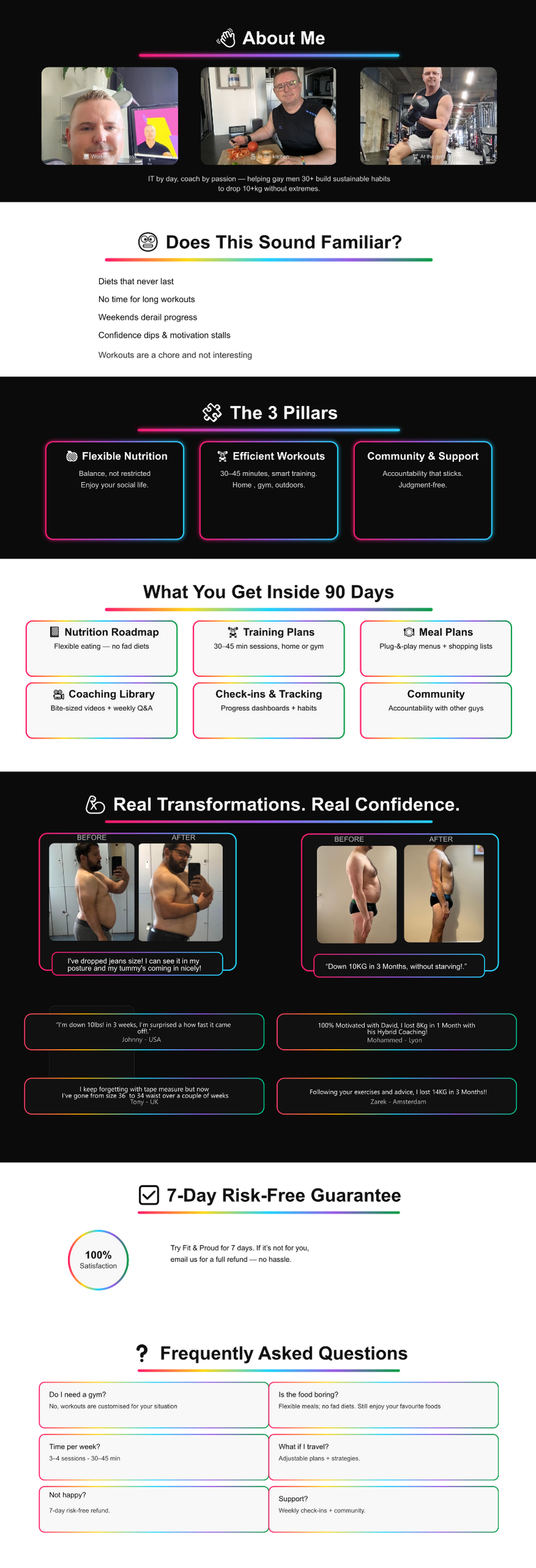 About Fit & ProudOnline Fitness Coaching for Gay Men Over 30Fit & Proud is an online fitness coaching program designed specifically for gay men over 30 who want to lose fat, build muscle and regain confidence without extreme diets or endless cardio.The program combines simple workouts, high-protein meal planning and structured guidance to help busy professionals transform their body and lifestyle in a sustainable way.This online fitness coaching approach focuses on realistic habits, efficient training and nutrition strategies that work for real life — not restrictive diets or hours in the gym.